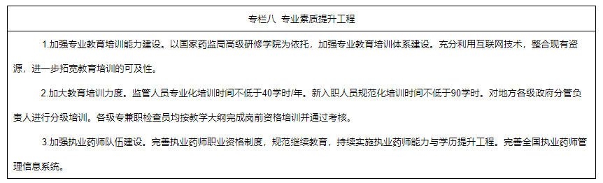 5.全面提升監(jiān)管隊(duì)伍專業(yè)素質(zhì)。實(shí)施專業(yè)素質(zhì)提升工程,大力開展專業(yè)能力教育培訓(xùn),有計(jì)劃地開展各級(jí)負(fù)責(zé)藥品監(jiān)管的部門負(fù)責(zé)人領(lǐng)導(dǎo)能力培訓(xùn)。加強(qiáng)全國(guó)藥品監(jiān)管隊(duì)伍專業(yè)化建設(shè),嚴(yán)把入口關(guān),穩(wěn)步提升監(jiān)管隊(duì)伍專業(yè)化水平。