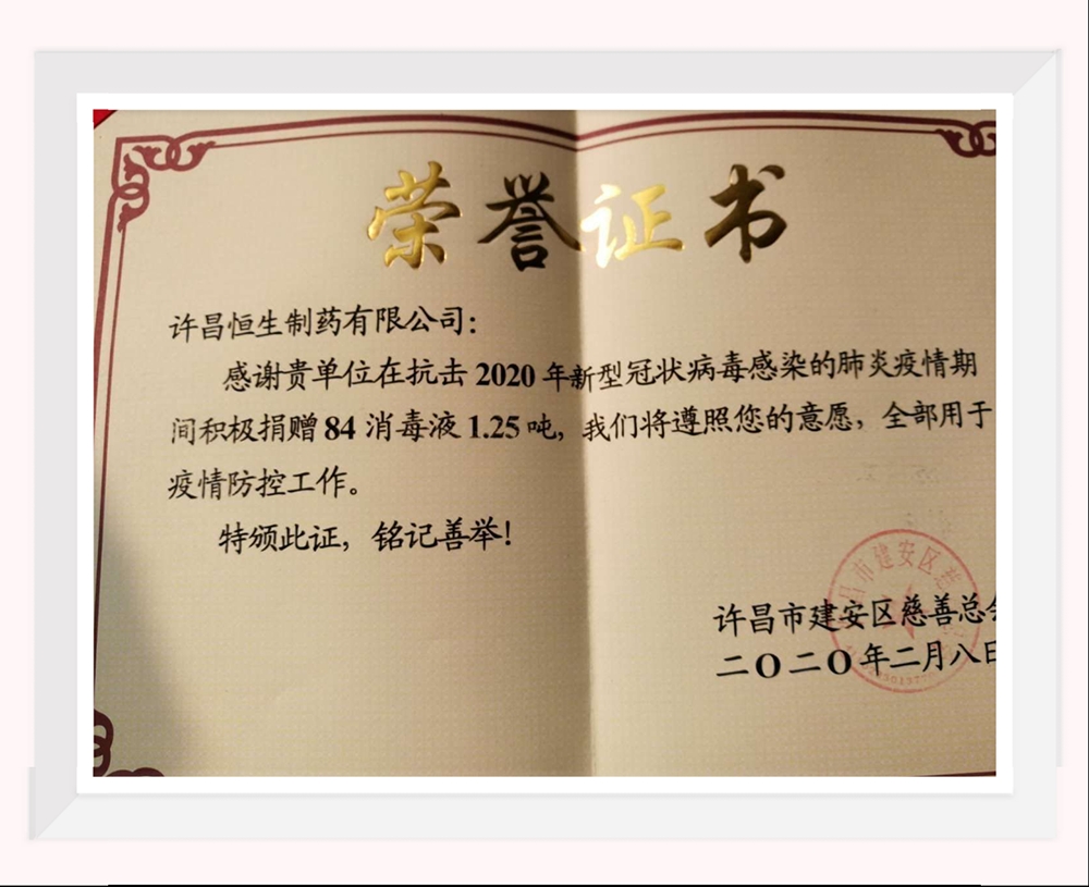 在得知相關(guān)防疫物資需求量不斷上升,各項物資處于緊缺的情況下,許昌恒生制藥有限公司第一時間通過許昌市建安區(qū)慈善總會捐贈84消毒液1.25噸,全部用于疫情防控工作。